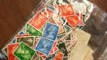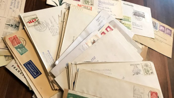 5 Umschläge, nach Ländern sortiert (jeweils 5-10 Marken drin