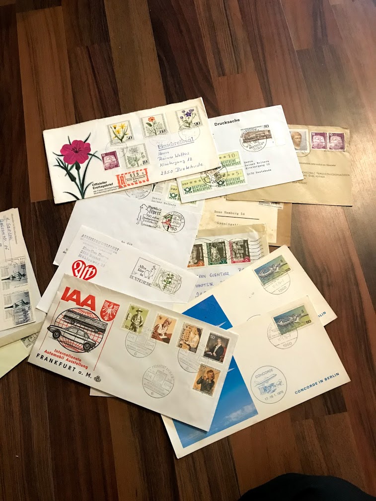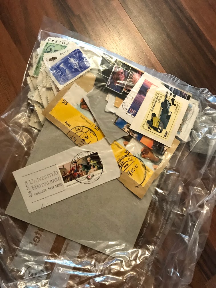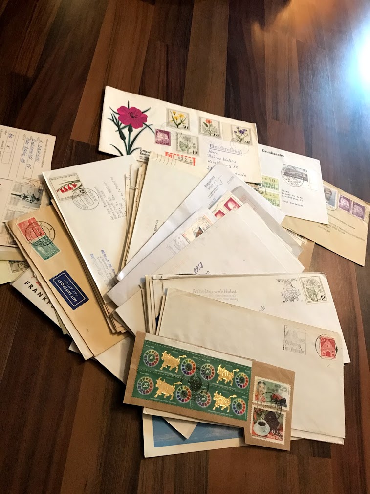 5 Umschläge, nach Ländern sortiert (jeweils 5-10 Marken drin