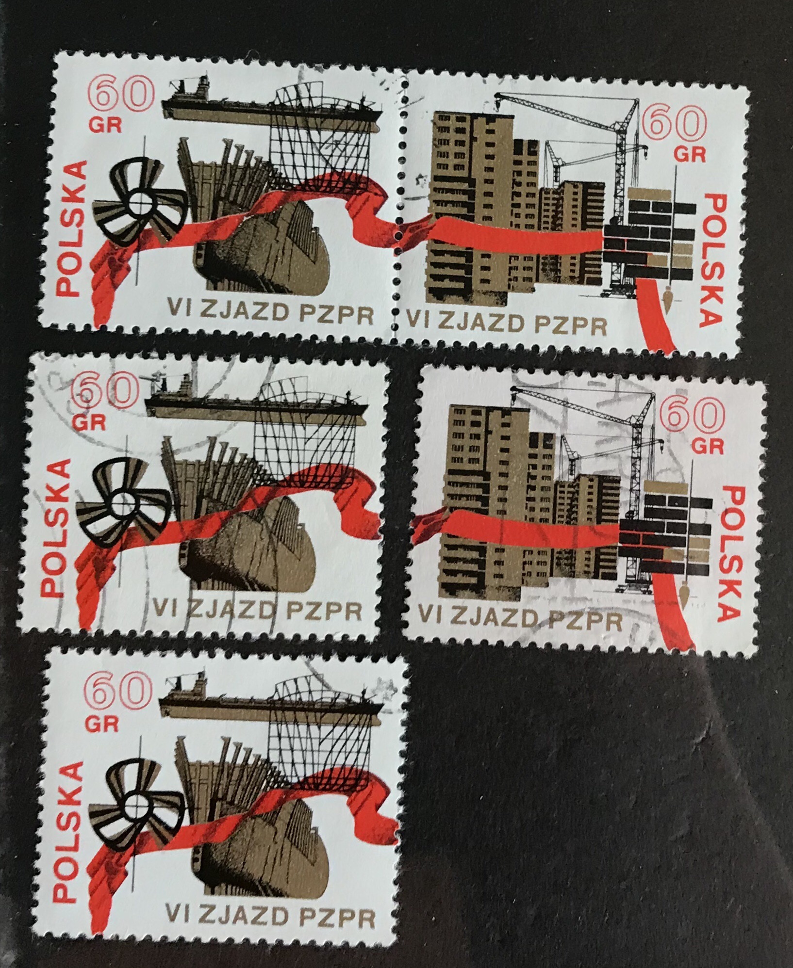 Die Marken aus Satz und Block sind wohl nicht zu unterscheiden. Sie haben die selbe Zähnung und die selbe Farbe, in meinem alten Osteuropa-Katalog (schwarz-weiss) ist die runde Fahnenschleife beim Satz schwarz und beim Block weiß abgebildet, aber das ist falsch. Sie ist in der Farbe rot bei Satz und Block.