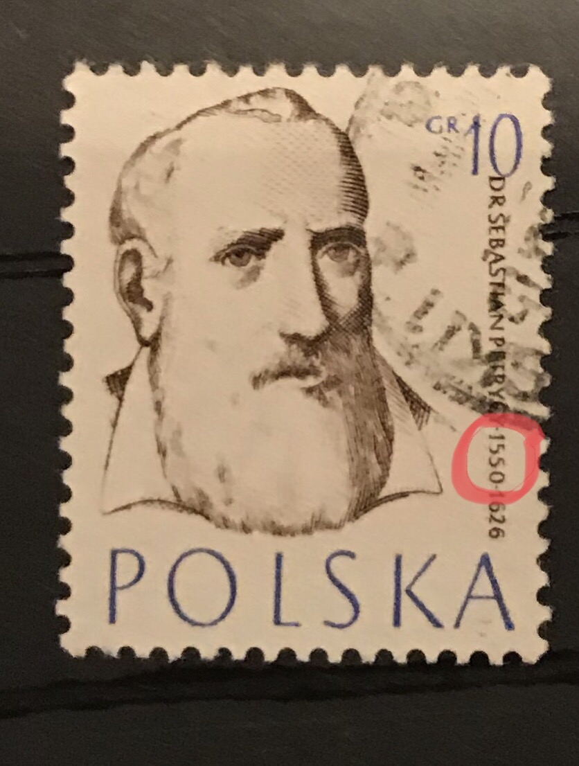 Bei der Serie "Berühmte Polnische Ärzte" von 1957 (Michel-Nr. 1008-1014) gab es gleich 2 Ungereimtheiten. Die 10-Groszy-Marke zeigt nicht, wie vorgesehen, den Arzt Dr. Innozenz Petrycy, sondern den Philosophen Dr. Sebastian Petrycy. Der ist 1554 geboren und nicht 1550. Ob 1550 zufällig das Geburtsjahr von Dr. Innozenz Petrycy war, konnte ich im Internet nicht herausfinden.