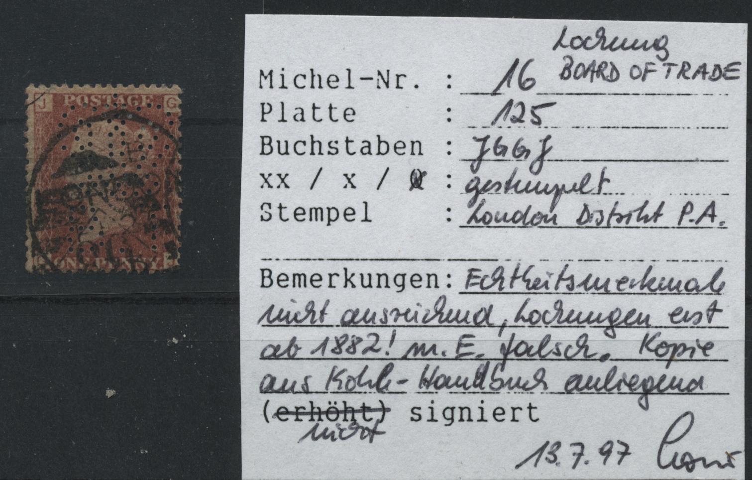 Lochungen gab es in GB auch für Dienstmarken. Hier die Lochung "Board of Trade" auf der Mi. 16.
