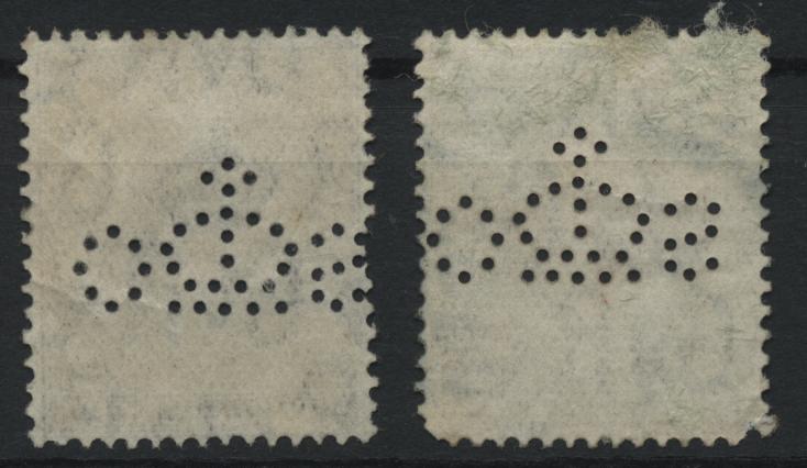 ich würde gerne wissen, was diese Lochung bedeutet. Im Netz habe ich diese Lochung nicht gefunden. Und zum anderen würde ich gerne wissen, warum unterschiedliche Stempel auf den Marken sind. Die Marken scheinen doch von einer Firma zu sein, oder?