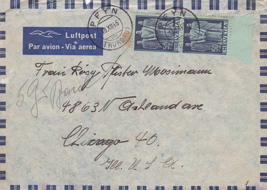 Aus meinen aktuellen Neuerwerbungen hier ein Beispiel. Es handelt sich um einen Luftpostbrief von Pfyn nach Chicago. Der Brief wurde am 18.12.1946 entwertet und trägt als Frankierung ein senkrechtes Paar der Mi. Nr. 377. In meinem Michel Schweiz/Lichtenstein Spezial 2008 ist eine Postbelegbewertung von 13,00 Michel-Euro verzeichnet. Gibt es für die Schweiz auch so etwas wie den Briefe-Katalog Deutschland, in dem Postbelege noch genauer unterteilt wird - EF, MeF und MiF? Und wenn ja, wie würde der gezeigte Beleg unter diesen Bedingungen bewertet?