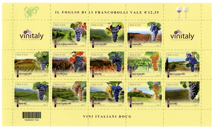 Aber hier noch eine Kleinigkeit von mir, die italienische Post bringt fast jährlich eine Marke mit Weinbezug raus. Im Jahre 2016 gab es eine Block/Kleinbogen (Foglio) mit Weinanbaugebieten raus.