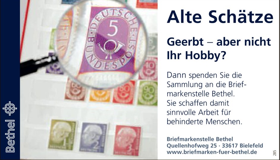 Die Werbung von Bethel sollte wohl besser Briefmarken zeigen, die von Briefen ausgeschnitten sind, also Portoware.
