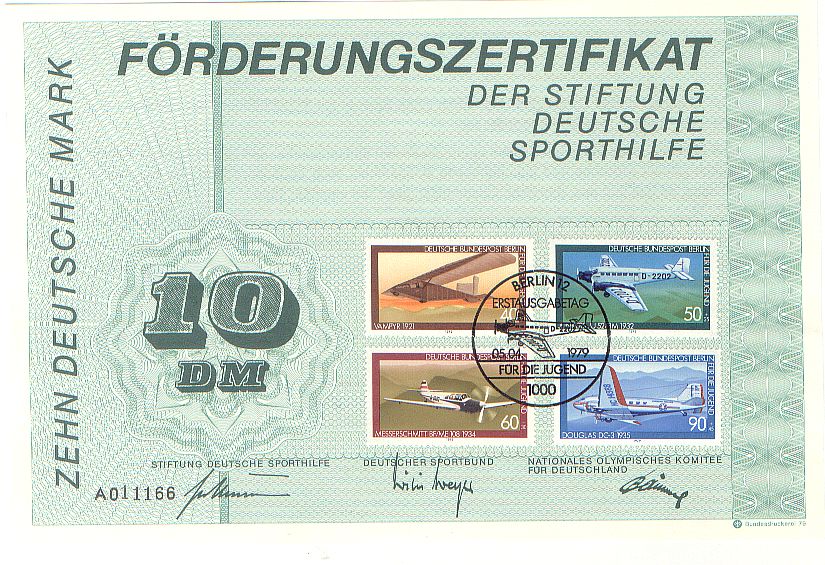 Leider werden diese Belege nicht notiert, es sind so eine Art Ersttagsblätter der Sportstiftung. Diese konnte man halt für 10 DM kaufen und damit ein gutes Werk tun. Heutzutage liegt sowas ab und zu mal, ausgeschnitten, in Kiloware. Weil die Marken abgeweicht auch nur einen Eckstempel haben, sind sie nicht sonderlich beliebt. Diese Zertifikate gibt es mindestens seit 1970, das ist das frühste was ich jemals gesehen habe.
