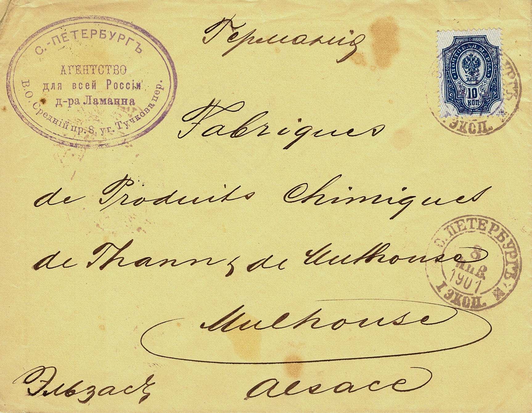Das heißt wohl: "St. Petersburg/Agentur für ganz Rußland/ Dr. Lamanna", darunter die Straße (?).