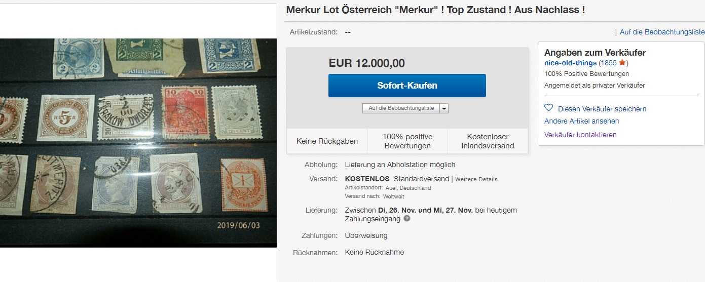 ...er hat offeriert Briefmarken für über 2Mio. € (seine Wunschvorstellung :); einige Marken sind mit unterschiedlichen Fotos zu unterschiedlichen Wunschpreisen eingestellt), der Michelwert aller Marken zusammen dürfte in dem meist unterirdischen Erhaltungszustand bei etwa 13,25 € liegen ;)