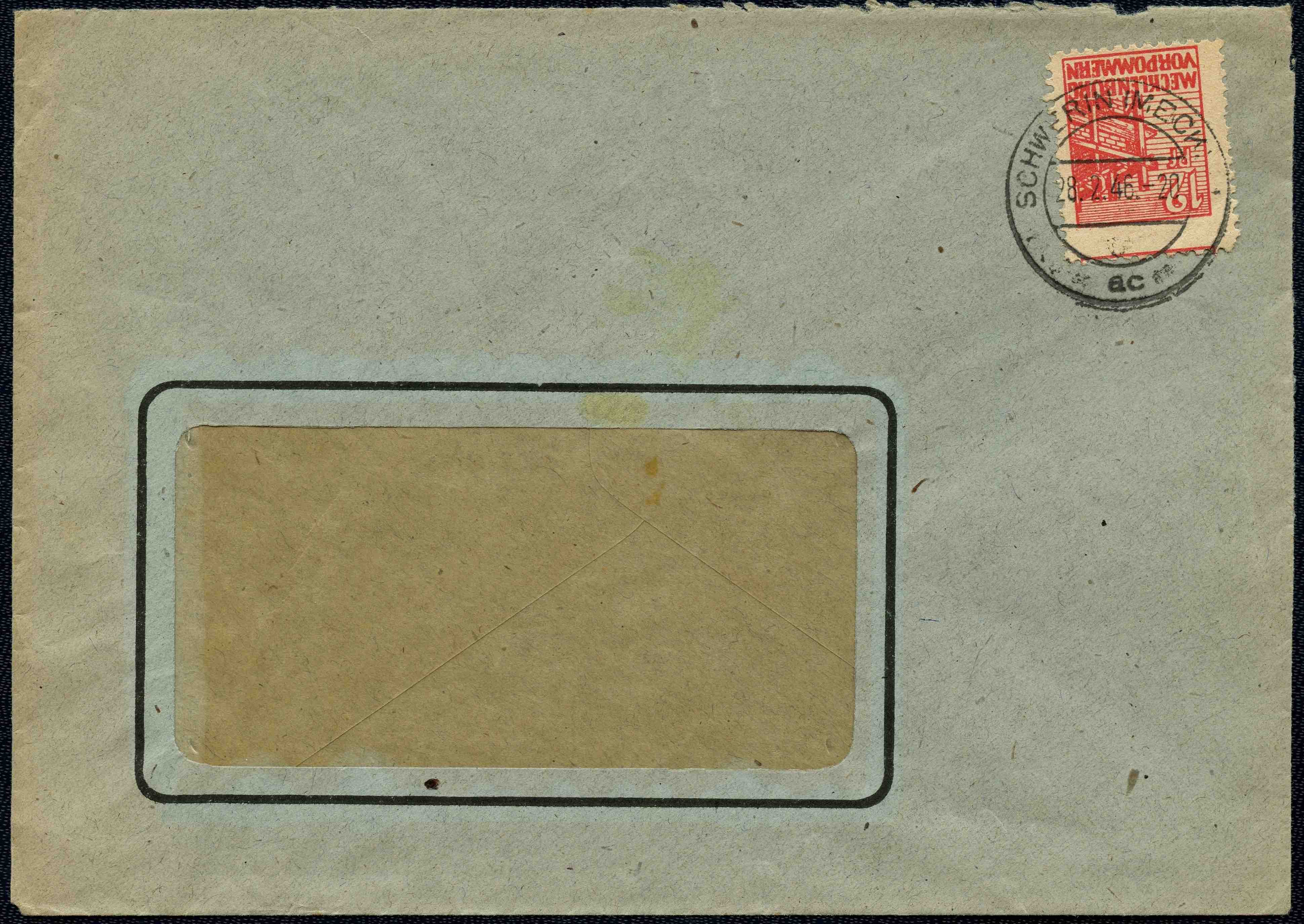 Portorichtig frankierter Inlandsbrief im Fernverkehr bis 20 g vom 28. Februar 1946 ab Schwerin (Sowjetische Besatzungszone). Das Porto in Höhe von 0,12 Reichsmark wurde durch Verwendung einer Mi.-Nr. 36 y entrichtet und das Postwertzeichen mit dem Zweikreisstegstempel "SCHWERIN (MECKL) 1 / ac" entwertet.