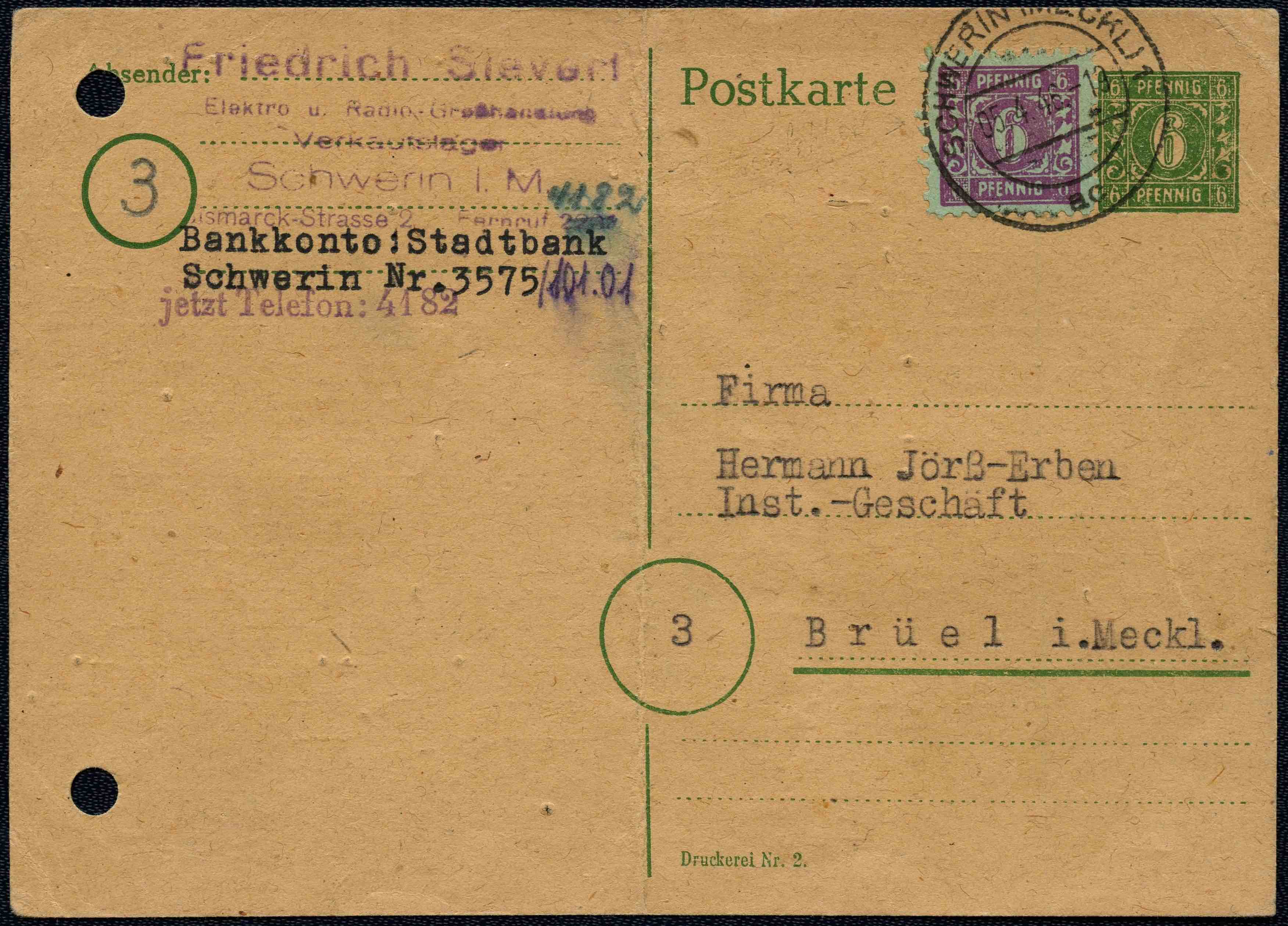 Portorichtige Mischfrankatur auf einer Postkarte im Fernverkehr vom 5. April 1946 innerhalb der OPD Schwerin ab Schwerin nach Brüel.