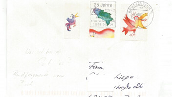 Hier wurde eine "Beauty-Mark" einer Cottbusser Friseur- und Kosmetik-Firma verklebt. Werbestempel "Schreib mal wieder", aus Cottbus - passt auch in die Rubrik der zweisprachigen Stempel aus der sorbischen Region.