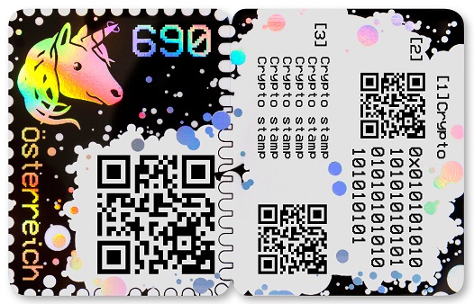 Am 11.6.2019 erscheint in Österreich die erste Crypto-Briefmarke. Sie kostet stolze 6,90 EUR. Auflage: 150.000 Marken in Blocks zu 1 Marke.