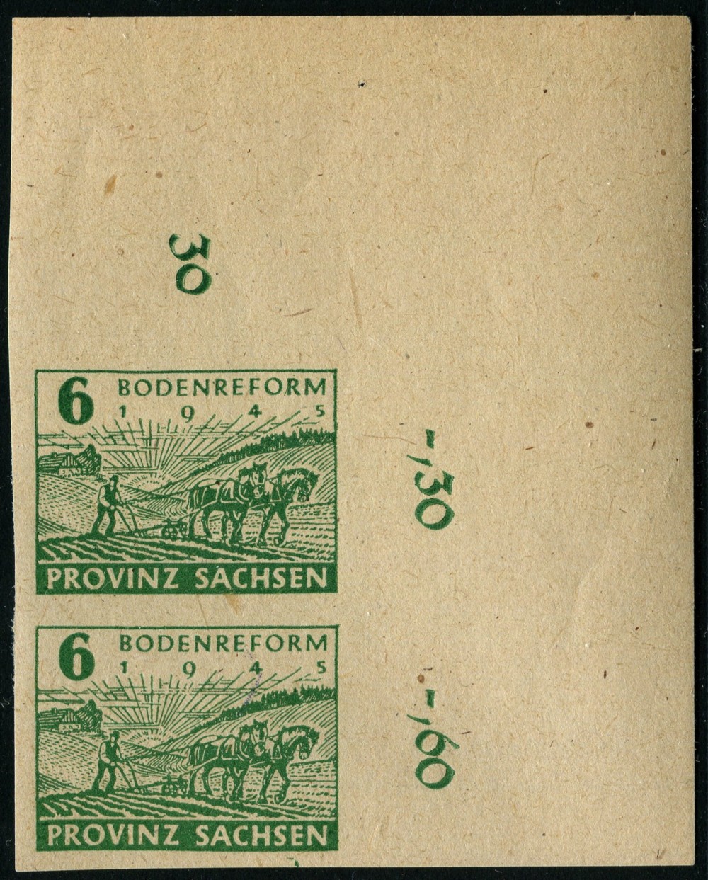Habe beim sortieren eine Marke der Provinz Sachsen gefunden welche einen grünen Flecken am oberen Rand hat. Vielleicht kann mir jemand sagen ob dies häufig vorkommt oder nur ein Zufall ist. Recht vielen Dank aus dem heißen TEXAS