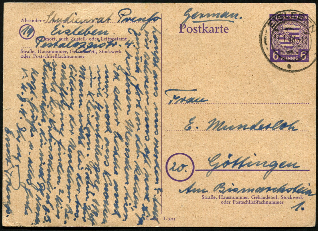 Fernpostkarte P 10 OPD Halle für die Provinz Sachsen vom 17.01.1946 aus Eilsleben nach Göttingen