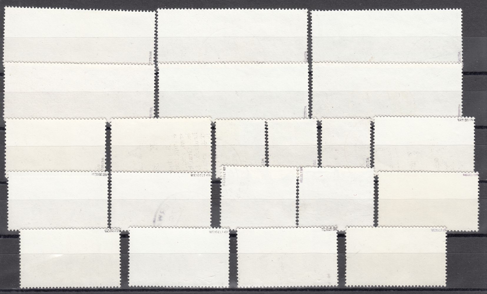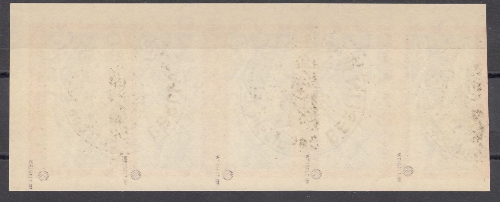 Wie gut zu erkennen, handelt es sich hier bei allen Marken Marken um Bogenstempel bzw. Bogensonderstempel. Es gibt jedoch keinen entsprechenden Prüfvermerk (schraffierter Kreis). Meines Wissens nach muss aber ein solcher Vermerk zwingend angebracht werden. Oder liege ich vollkommen falsch???