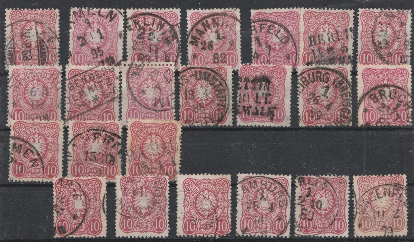 die Linke 43 ist die a Farbe Wert 35,- und die zweite 44 von rechts mit Stempel Berlin C von 1882 ist ebenfalls die a Farbe (bis 1886 gab es nur die a) Wert 2,-