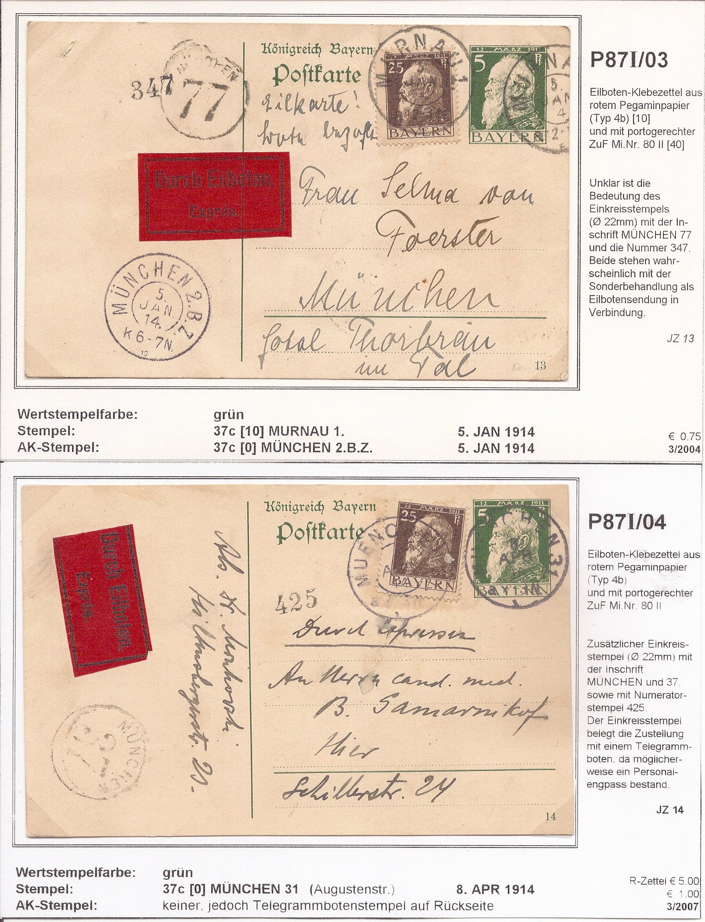 Die Erklärung ist einfach; Die obere Karte habe ich im Jahr 2004 eingeordnet, die untere erst im Jahr 2007. Zwischenzeitlich bekam ich von einem Sammlerfreund, der Mitglied in der Forschungsgemeinschaft Münchner Postgeschichte e.V. Im Rundbrief 11 Seite 5 (Kapitel Briefzusteller- und artverwandte Stempel in München) erfuhr ich mehr. Dort steht unter anderem: "Eilboten- und Telegrammzusteller-Stempel der Bayerischen Post Im Gegensatz zu den gewöhnlichen Postsendungen, wurden eilige Sendungen nicht den Briefträgern zur – ggf. erst am nächsten Werktag stattfindenden – Zustellung übergeben, sondern zur beschleunigten Beförderung möglichst unmittelbar von einem besonderen Boten zugestellt. Dies betraf zum einen Eilbriefe, bei denen nur die Zustellung beschleunigt erfolgte, zum anderen Telegramme, bei denen auch die Nachrichtenübertragung in elektronischer Form zu einer Beschleunigung führte. Wie die Briefträger erhielten auch die Eilboten- und Telegrammzusteller eigene Stempel, die durch eine Nummer gekennzeichnet sind. Die erste Art dieser Stempel unterscheidet sich deutlich von den zur gleichen Zeit verwendeten Briefträgerstempeln durch die Angabe des Ortsnamens „München“. "