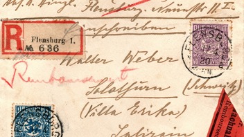 meine kleine Schleswig-Abstimmung Sammlung freut sich über einen Neuzugang. Ein eingeschriebener Nachnahmebrief aus Flensburg in die Schweiz. Ich vermute mal, dass aufgrund irgendeiner UPU-Regelung die Bestimmungen für Auslandsnachnahmesendungen die Bestimmungen in Dänemark und Deutschland gleich waren: Auslandsnachnahmesendungen waren als Einschreiben zu versenden. Die Nachnahmegebühr wurde bei Auslandssendungen nicht verklebt sondern vom einzuziehenden Betrag abgezogen. Im April 1920 betrug das Auslandsbriefporto und die Einschreibegebühr jeweils 30 Pfg, zusammen also 60 Pfg. Hier mit je einer 20 Pfg. und 40 Pfg. Schleswig Abstimmung portogerecht frankiert.