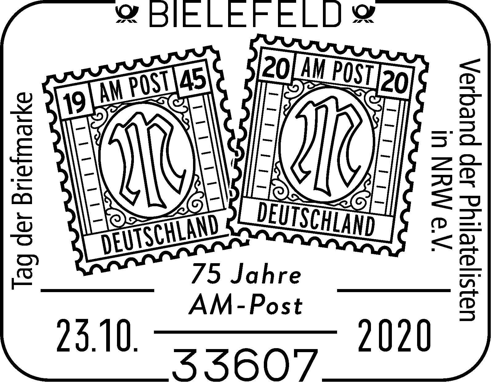 Am 3. September 2020 erscheint in der Serie Tag der Briefmarke ein 95-Cent-Wert mit dem Motto: 75 Jahre AM-Post-Marken. Wie die Marke aussieht, kann man noch nirgends sehen, aber die Briefmarken-Gemeinschaft Bielefeld hat bereits einen Sonderstempel ihrer Stadt zu diesem Jubiläum, allerdings mit dem Datum 23.10.2020, vorgestellt, da ist wohl eine Ausstellung geplant: