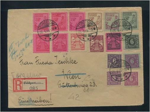 12Pfg. Bauernhaus 1946 mit Nr. 8x PF II, 9a-c (c inkl. PF XV), 10x PF X, 11xa, 11xb, 11y, 16, 13x, 14x, 15a, 16, 18c + 19x zusammen auf unterfrankiertem R-[ (Alter Feldpost-R-Zettel mit hds. Ortsangabe) von TORGELOW 8.4.46 nach Wien / Österreich mit hds. Zurück-Vermerken, Marken rückseitig einzeln geprüft Kramp BPP, Kuvert leichte Rand- und Alterungsspuren, Tinte etwas verlaufen - Trotz der Einschränkungen interessanter Beleg!