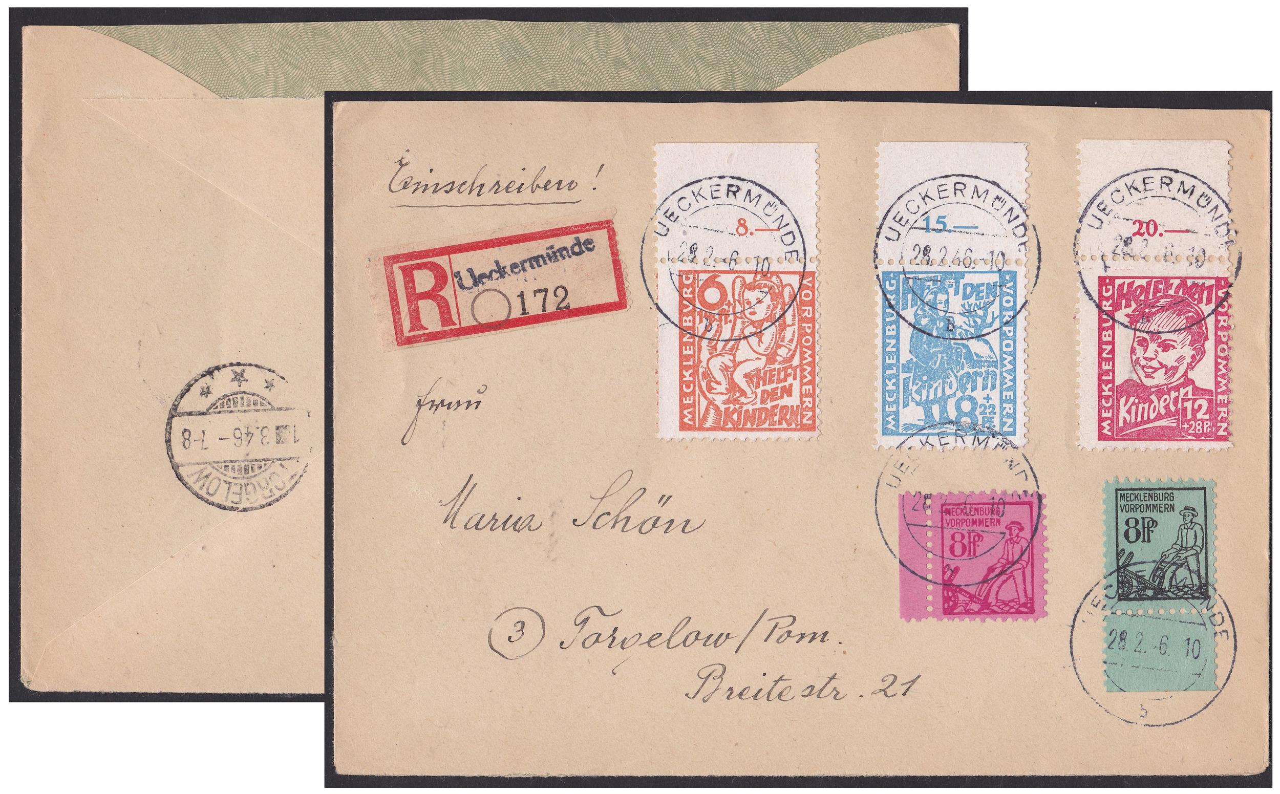 6+8+12Pfg. Kindernhilfe 1945, Unterrandsatz inkl. Plattenfehler Nr.2a PF V mit Nr.18c (Oberrand) + Nr.9b (Unterrand mit leichter Verzähnung) zusammen auf R-[ /Alter Feldpost-R-Zettel mit hds. Ortsangabe / 2Pfg. überfrankiert ) mit Notstpl. "TORGELOW 26.1." nach Wolfshagen, rs. Ankunftsstpl. "WOLFSHAGEN 7.2.46 über GOSLAR", leichte Spuren, bestgeprüft Kramp BPP (ca. 400,-)