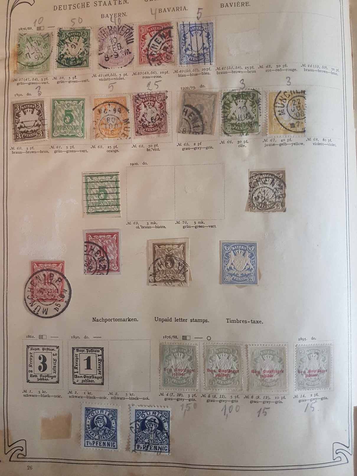 Auf den ersten Blick nichts Weltbewegendes. Meistens die häufigsten Marken aus den Sätzen, einige auch schadhaft. Eben der Anfang einer Anfängersammlung (wobei der Paul sich damals sicher über jedes neu bestückte Feld gefreut hat). Schönes altes Album, aber die Stock- und sonstigen Flecken sind gar nicht gut, und bei den Bleistiftnotizen (vielleicht sind das Katalogwerte in Pfennigen, aber von wann?) hat einer aber ganz schön aufgedrückt. Also alles in allem eigentlich "nix wert", mehr 'was zum Verschenken als zum Verkaufen. Mehr emotionaler als materieller Wert.