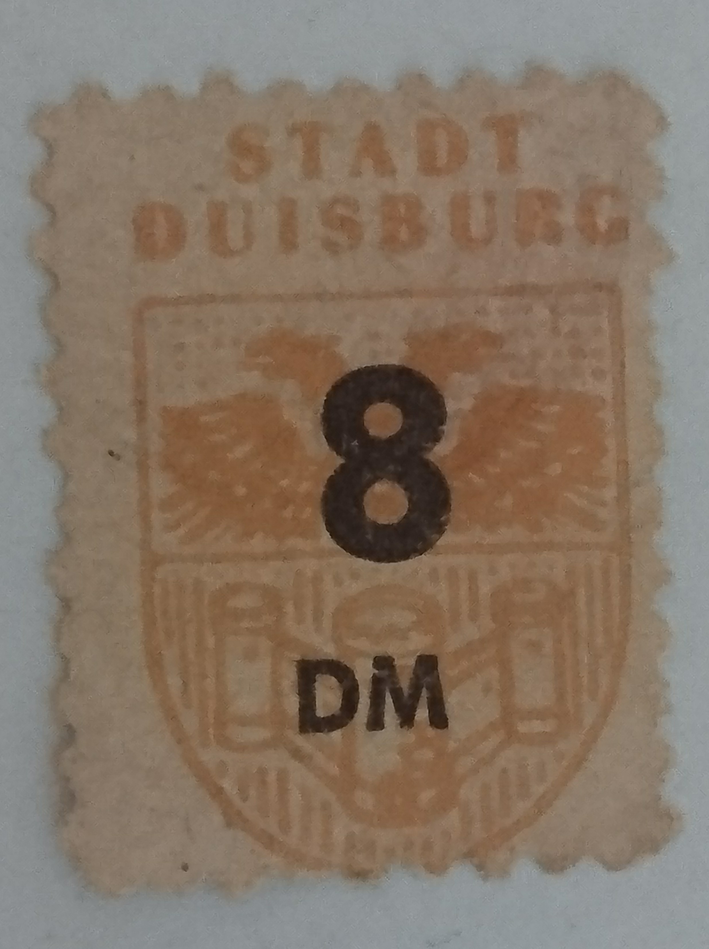 das ist keine Briefmarke, sondern wahrscheinlich eine Gebührenmarke der Stadt Duisburg. Stammt auf jeden Fall aus der Zeit nach 1949 ("DM"), ich würde aufgrund der Optik auf 1950er- oder 1960er-Jahre tippen.