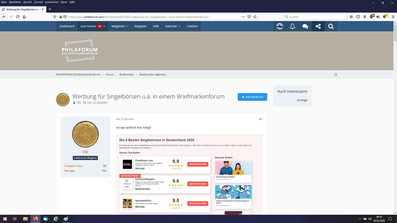 Werbung für Singelbörsen u.ä. in einem Briefmarkenforum