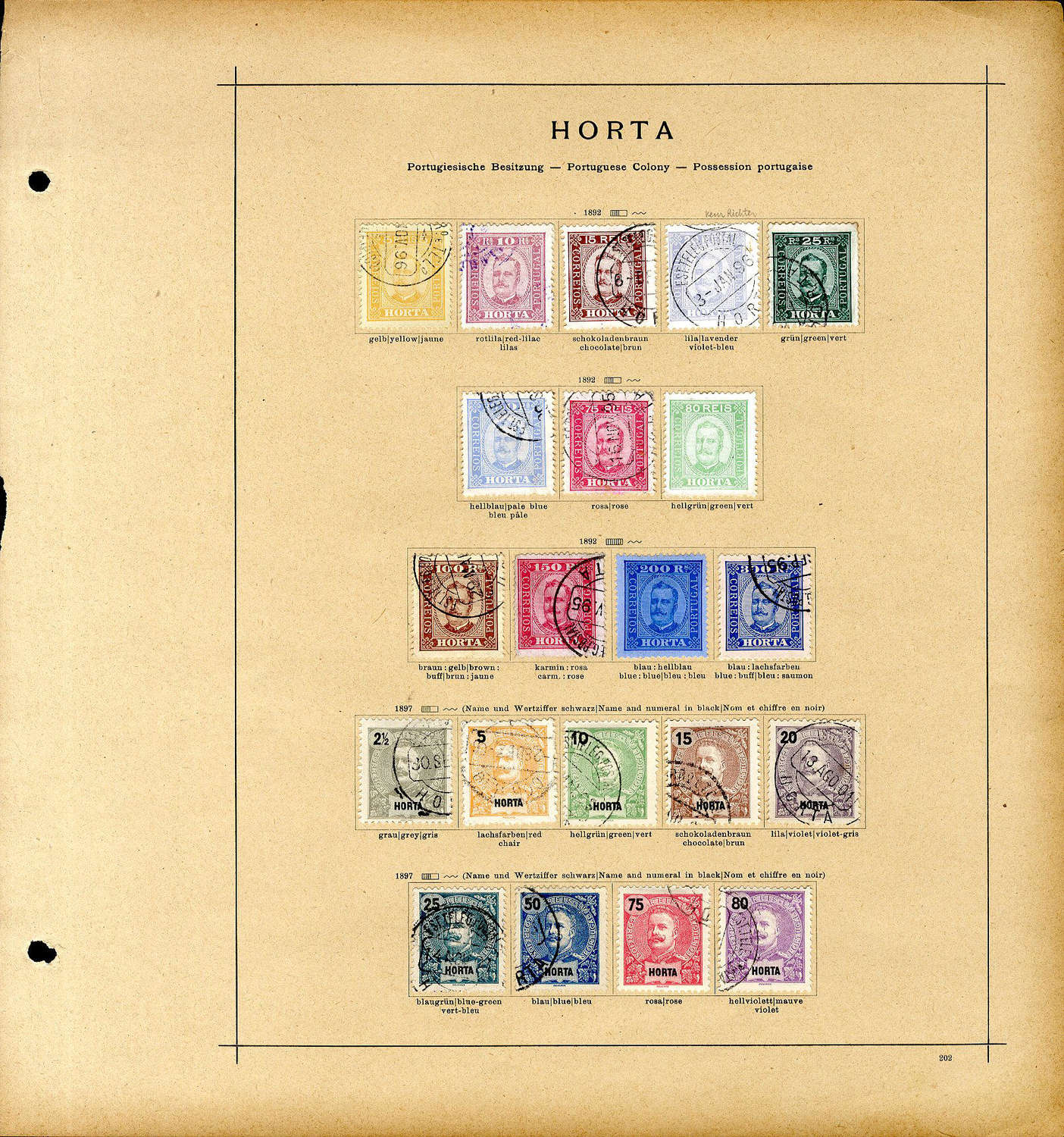 Auch von den von Jean Philippe erwähnten zwei zusätzlichen Azoren-Distrikten Horta und Angra wurden die 5-Reis-Marken von 1892 als Halbierungen zugelassen, die Angra-Marke gibt es zusätzlich noch auf gestrichenem und gewöhnlichem Papier. Auch von diesen beiden Gebieten fand ich nur ganze Marken im Netz, aber keine Halbierungen: