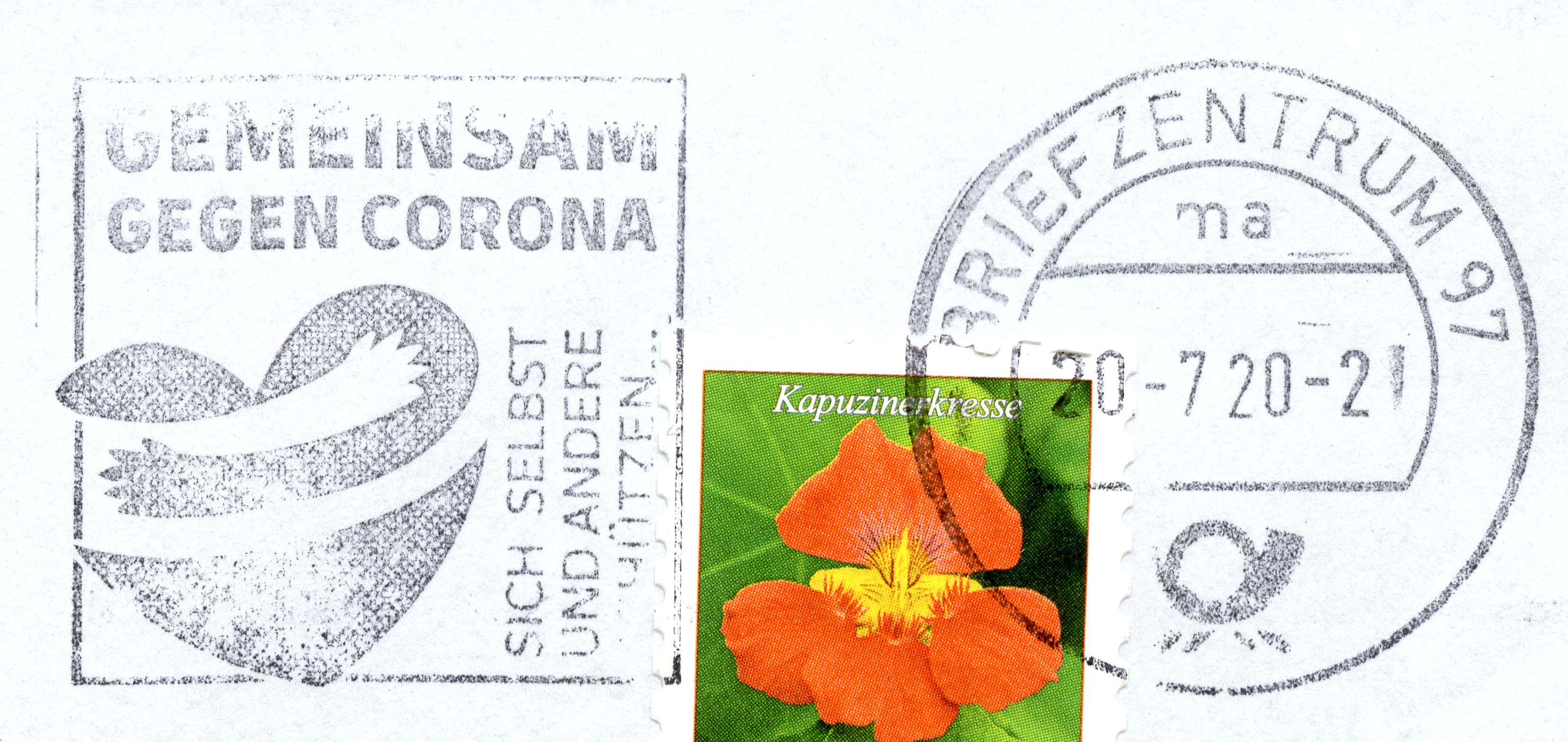 Ab 1. Juli gibt es von sehr vielen, wenn nicht von allen Briefzentren in Deutschland, einen neuen Werbestempel "Gemeinsam gegen Corona". Wer die wohl alle komplett haben will, hat eine gewaltige Aufgabe vor sich. ;)