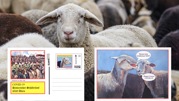 Der Phialtelistische Club in Markgröningen gab dieses Jahr eine Ganzsachenkarte auf Privatbestellung heraus zum alljährlichen Schäferlauf. Leider fiel diese Veranstaltung wegen des Corona-Virus aus. Der Werteindruck zu 60 Cent zeigt ein Schaf. In dem gelben Kästchen links unten steht: COVID-19 Historischer Schäferlauf 2020 Adieu. Der Beleg soll nur in einer Miniaturauflage (?) erschienen sein.