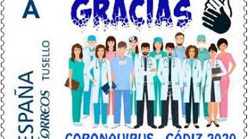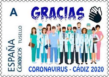 Auch in Spanien gibt es personalisierte Briefmarken. Hier zwei aus Calahorra und Cadiz, die sich mit dem Corona-Virus befassen: