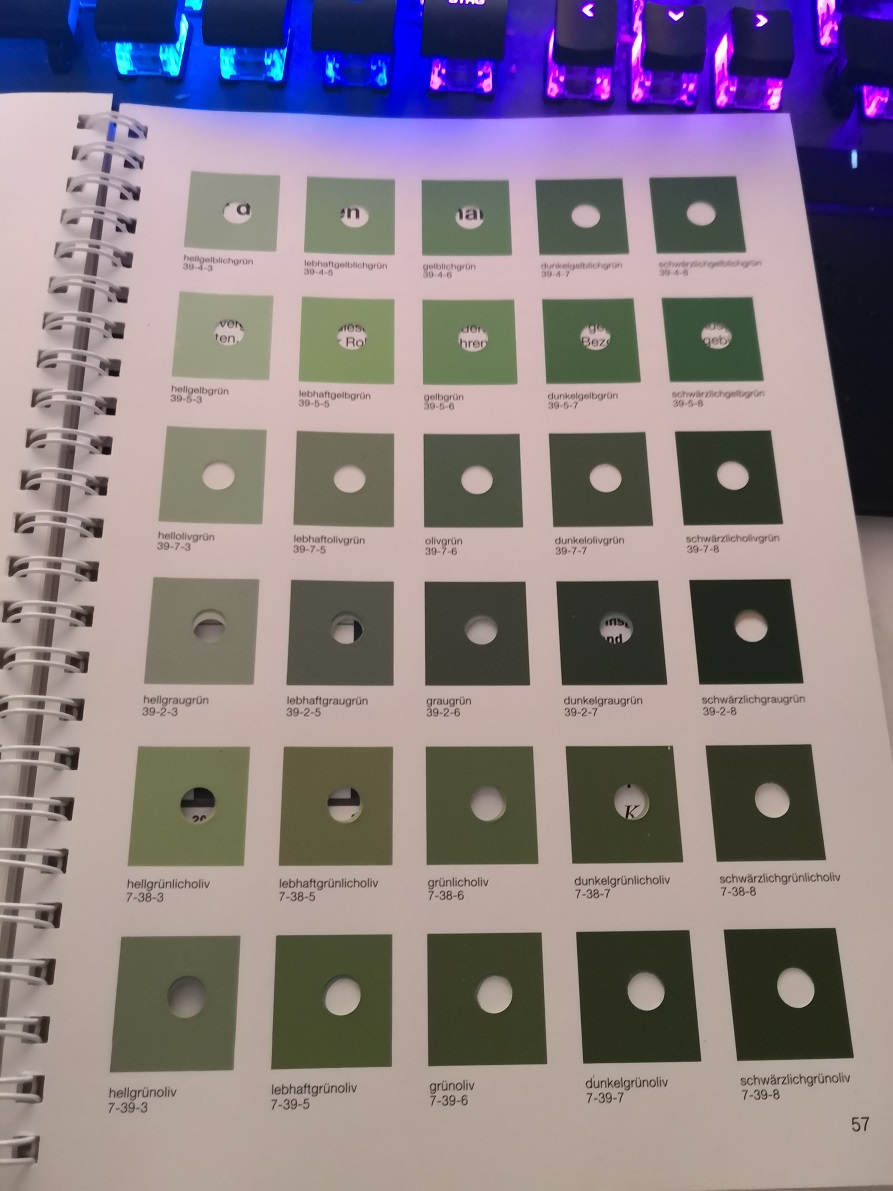 Stimmt! Sind jetzt eigentlich die Farbangaben im Katalog auch im Farbenführer vorhanden? Meines Wissens war das nicht immer so. BTW : Mein Farbenführer ist die 36. Auflage. Ich komme einigermaßen damit zuecht. Schwierig wird es bei Grautönen (Siehe Beispiel).