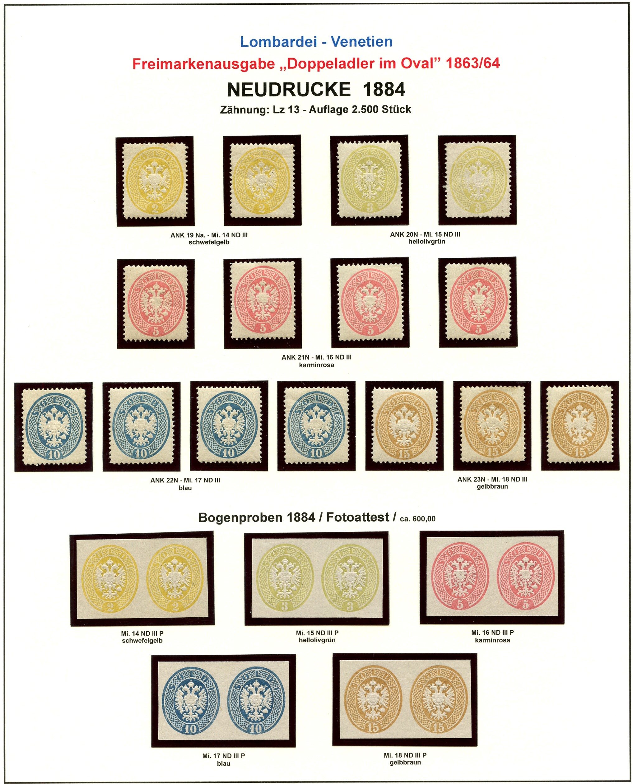 Ein Neudruck ist auch möglich. Der Michel hat die auch katalogisiert bei Lombardei und Venetien am Ende der normalen Marken. Von den Ausgaben aus dem Jahre 1863 und 1864, zu denen auch die 2-Soldi-Marke gelb gehört, gibt es 3 verschiedene Neudrucke mit der Katalogisierung 14 ND schwefelgelb, orange aus den Jahren 1884-1887. 2 Neudrucke kann man auch an der geänderten Zähnung erkennen, einmal 13 und einmal 10 1/2. Die Originalmarken haben die Zähnungen 14 (Michel-Nr. 14 von 1863) oder 9 1/2 (Michel-Nr. 19 von 1864).