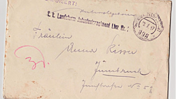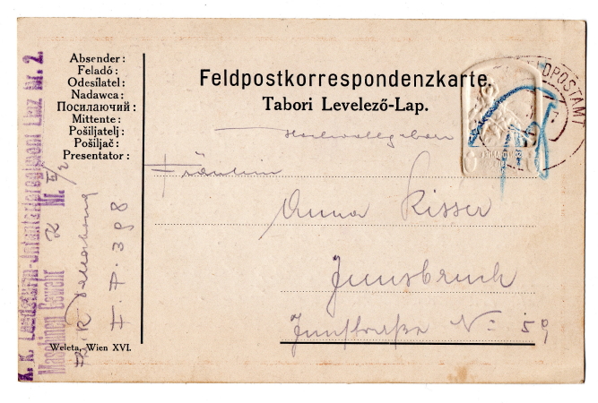 Für Feldpost-Belege gibt es keine Kataloge. Sie wurden im Krieg ohne Marke kostenlos für die Soldaten befördert. Den goldenen Isonzo-Prägedruck findet man auch bei Ebay auf Postkarten und auf Briefpapier: