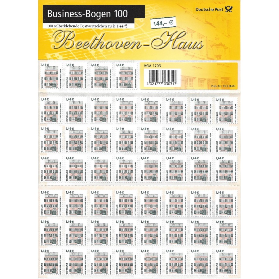 Unter der Michel-Nr. BB 1 wird zukünftig im Michel-Katalog eine neue Erhaltungs-Form von Markenheftchen katalogisiert. Dieser Business-Bogen enthält 100 Stück der Freimarke "Beethoven-Haus" zu 1,44 EUR und wird als echtes Markenheft bezeichnet. Anscheinend soll es von diesem Bogen 2 Auflagen geben, die sich durch eine unterschiedliche Stanzung unterscheiden, und zwar eine kantige und eine abgerundete Stanzung.