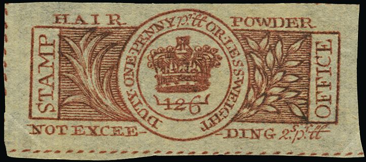 England verlangte vor langer Zeit einmal Steuern für Haarpuder. Hier eine 1-Penny-Steuermarke, die mal für 650,- engl. Pfund (ca. 738,- EUR) von Stanley Gibbons angeboten wurde: