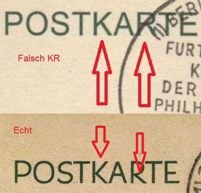 Echt hat schärfere Konturen (z.B. Fenster im Gebäude). Die falschen Karten wurden vermutlich in einem anderen Druckverfahren hergestellt.