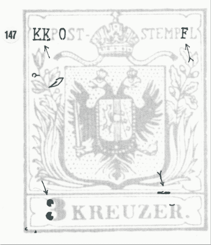 Seit kurzem besitze ich die Fachliteratur "3 Kreuzer Type Ia1" von Klaus Hirsching (2010) und hab mir gleich meine wenigen Briefmarken dieser Type aus meiner Sammlung näher angesehen. Dabei bin ich auf 3 Plattenfehler (147, 241, 280) gestoßen.