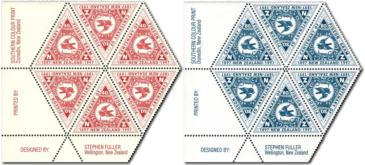 Von den beiden neuseeländischen Inseln Great Barrier Island und Marotiri gibt es die ersten Taubenpost-Briefmarken. Ab 1898 konnten damit Nachrichten per Brieftaube ans Festland befördert werden. Es handelt sich wohl um eine Art Privatpost, da ich diese Marken nicht im Katalog unter Neuseeland finden konnte. Zum 100jährigen Jubiläum dieser Post gab es jedoch auch eine offizielle Ausgabe von Neuseeland: