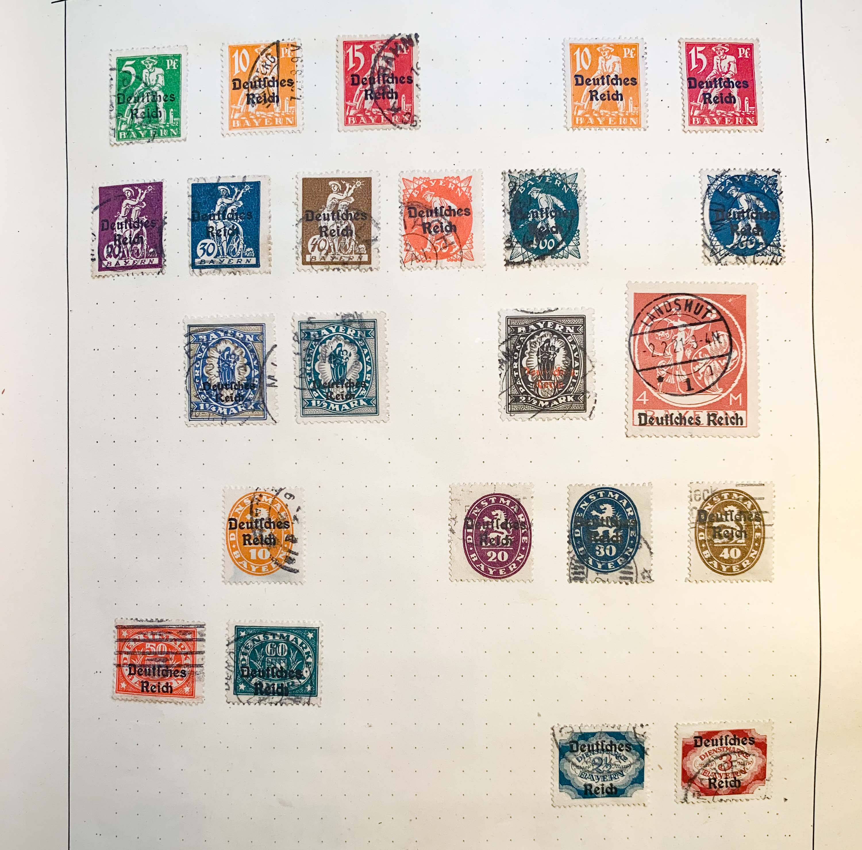 meine Großmutter hat mich gebeten die Sammlung ihres 1985 verstorbenen Mannes zu prüfen und ggf. zu veräussern. Es handelt sich um ein großes Buch mit über 100 Seiten. Es zeige hier erstmal die ersten 9 Seiten und bitte um eine Einschätzung, ob die Marken in Wert und Zustand überhaupt interessant sind. Neben Kaiserreich, Weimarer Republik und der Nazizeit sind auch Marken aus den deutschen Kolonien und verschiedener Länder dabei. Bessere Fotos kann ich bei Bedarf noch nachreichen.