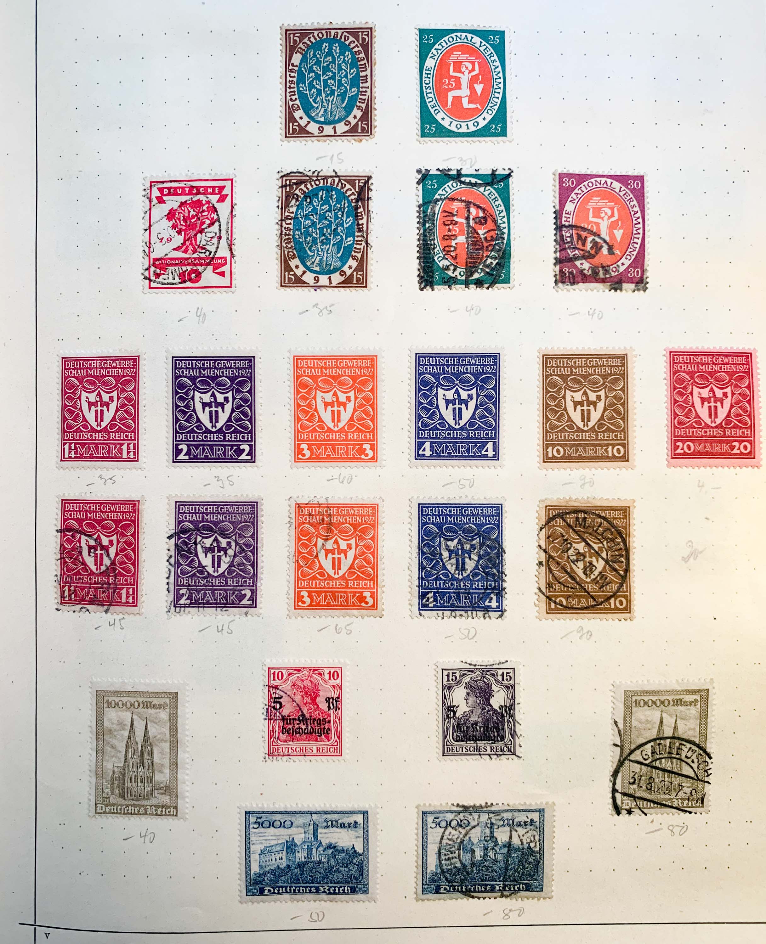 meine Großmutter hat mich gebeten die Sammlung ihres 1985 verstorbenen Mannes zu prüfen und ggf. zu veräussern. Es handelt sich um ein großes Buch mit über 100 Seiten. Es zeige hier erstmal die ersten 9 Seiten und bitte um eine Einschätzung, ob die Marken in Wert und Zustand überhaupt interessant sind. Neben Kaiserreich, Weimarer Republik und der Nazizeit sind auch Marken aus den deutschen Kolonien und verschiedener Länder dabei. Bessere Fotos kann ich bei Bedarf noch nachreichen.