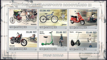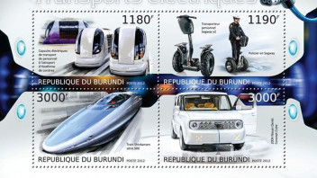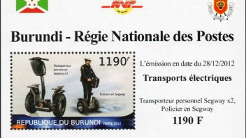 Heute soll der letzte Segway vom Band laufen. Von diesem seltsamen Fahrzeug gibt es nur sehr wenige Briefmarken, und nach dem Auslaufen der Herstellung wird es wohl auch keine neuen mehr geben. Ausgerechnet afrikanische Staaten, bei denen man am wenigsten diese Fahrzeuge erwartet, verausgabten Marken oder Blocks mit diesem Motiv.