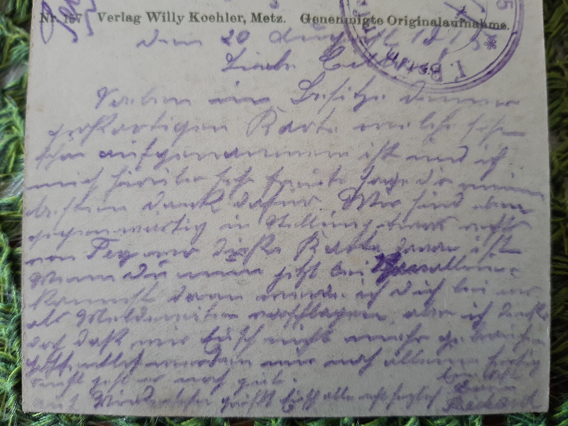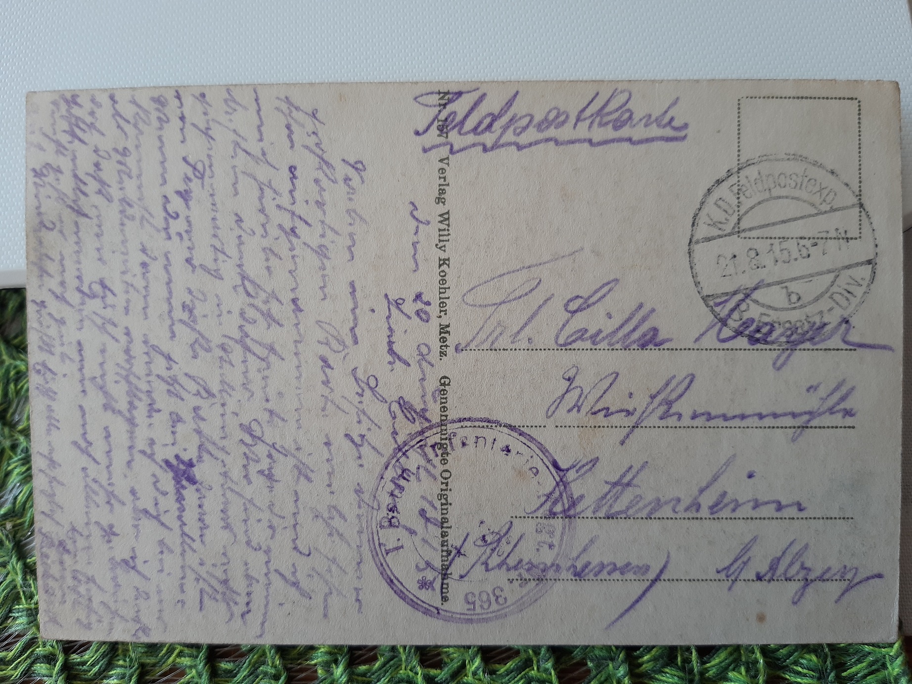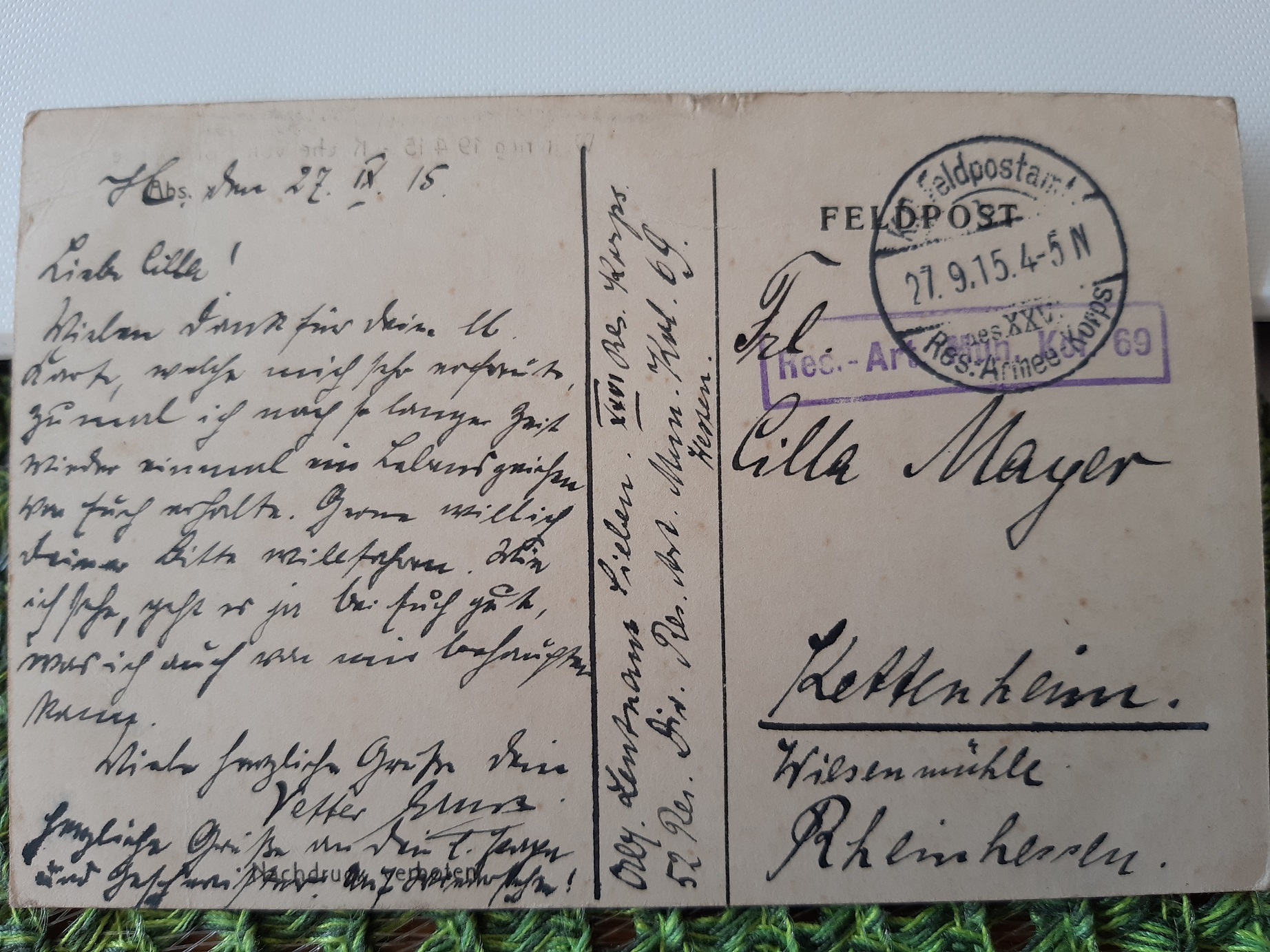 Durch eine Hausauflösung von Bekannten, kam ich an 6 alten Feldpostkarten aus dem 1.WK. Finde es interessant, das sie an Gilla Mayer aus Kettenheim, das in meiner Nähe liegt (Alzey), gerichtet waren.