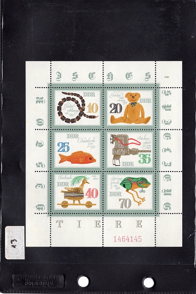Bei dem Bild DDR 1981 Kleinbogen ...jpg handelt es sich im die Michelnummern 2661-2666. Es ist von den teilweise durchgezähnten Varianten die preiswerteste und wird im Katalog mit einem Aufschlag von 10 % auf den Kleinbogen ** von 4,40 Euro bewertet. Es gibt bei Kleinbögen keine Bezeichnungen, wie bei Schalterbögen.