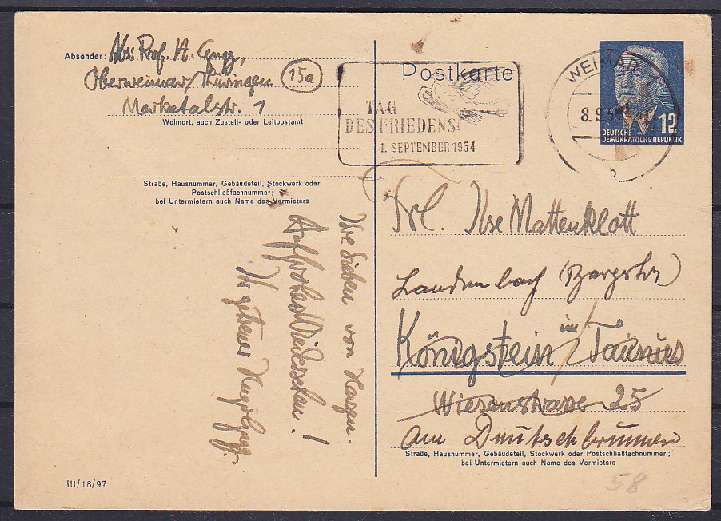 Die zweite von Kartenhai gezeigte GS ist eine normale GS (keine Ahnung welche, kenne mich da nicht aus), die links mit dem Bild und "TAG DER BRIEFMARKE 1954 ..." überdruckt wurde. Daher gibt es hier auch zwei Druckvermerke: Einmal die Druckereinummer "III/18/97" links unten von der Original GS und dann rechts unten "III/6/29 1353 1 Kv 8383-54" vom Überdruck. Wobei die III/6/29 die Druckereinummer ist und einer Druckerei (oder Verlag) gehört, die in der Stadt oder dem Landkreis Chemnitz ihren Sitz hatte (III = Sachen und 6 = Stadt bzw. Landkreis Chemnitz). Die 29 ist leider nicht bekannt. Hier ein Link zu der bisher umfangreichsten Liste der Druckereinummern aus der ehem. DDR die ich bisher gefunden habe: DDR: Druckvermerke (Moneypedia).