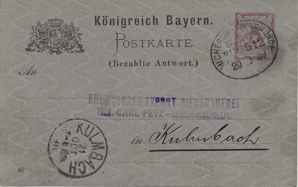 Es handelt sich um den Antwortteil einer P32/04. Die bezahlte Antwort stammt von der Kulmbacher Export-Bierbrauerei. Entwertet wurde der Wertstempel am 20.10.1889 mit einem ovalen Bahnpost-stempel (Zugnummer leider etwas verschmiert) der Bahnstrecke DUCHEROW-SWINEMÜNDE .