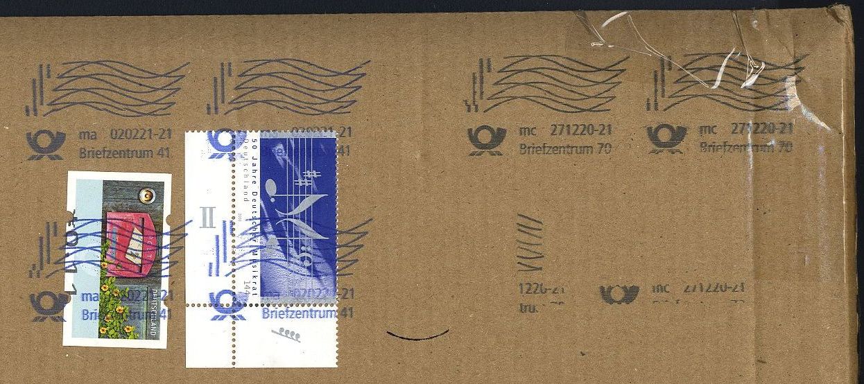 Schwarzer Stempel vom 27.12.2020 von BZ 70 und blauer Stempel vom 02.02.2021 von BZ 41 auf einem Brief.