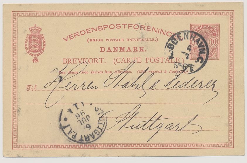 Diese Karte is von Kjøbenhavn, 4 Juli 1896 nach Stuttgart gesendet wurde. Ankunftstempel "STUTTGART P. A. I (I) / 6 JUL 96".