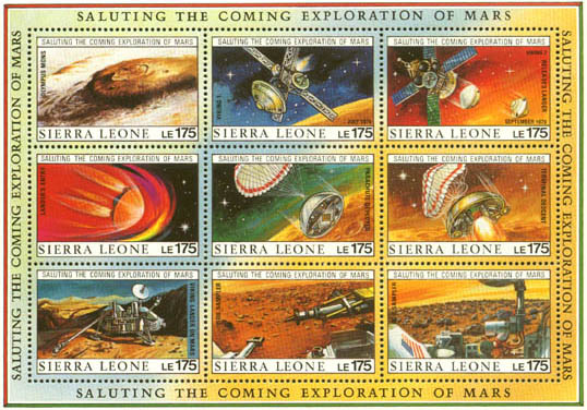 Es gibt einen bekannten Souvenirbogen "Face on Mars" (Marsgesicht) von einem fleissigen afrikanischen Staat. Ich hatte mal in den Staaten einen Sammler getroffen, der seit über 10 Jahren einen echt gebrauchten Souvenirbogen suchte (und damals schon $500 bot dafür). Ich glaube er sucht immer noch wenn er noch lebt...